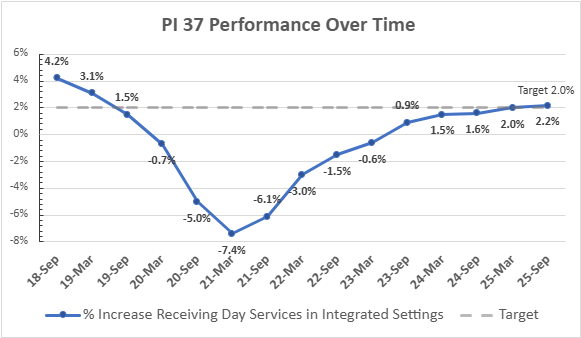 The Commonwealth will work to achieve a goal of a 2% annual increase in the percentage of individuals on the DD waiver receiving day services in the most integrated settings.