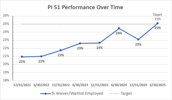 • 51. The Commonwealth will work to achieve a goal of meeting its established employment target of 25% for adults aged 18 to 64 on DD waivers and the waitlist. DBHDS will continue to work with the Employment First Advisory Group, the QIC, and the QIC subcommittees to develop and recommend QIIs to enhance employment of adults aged 18 to 64 on the DD waiver and the waitlist. If the goal is not met within two years of the date of this Order, DBHDS will conduct a root cause analysis and implement a QII. DBHDS will continue this quality improvement process until the goal is achieved and sustained for one year.